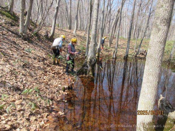 会員10名が参加し、午前中は薪用丸太置場の整備とスイス積みの土台作り、A3・4区の整理伐木の選木作業で心地よい汗をかき、午後は林内の自然観察を行い春の森を満喫しました。大満足❢の一日でした。