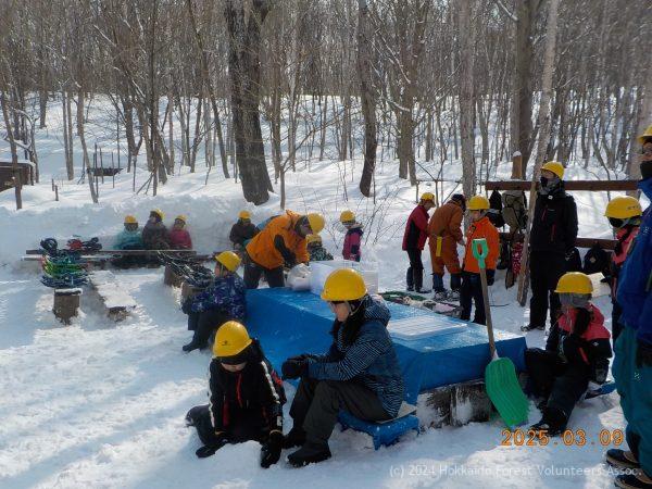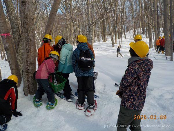 その後、西野澄子さんから冬芽の話を聞き小屋前に戻り、以前に収穫した樹液を煮詰めたシロップをクラッカーに付けて全員で食べ樹液の美味しさを感じました。