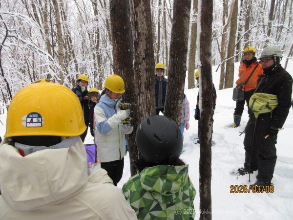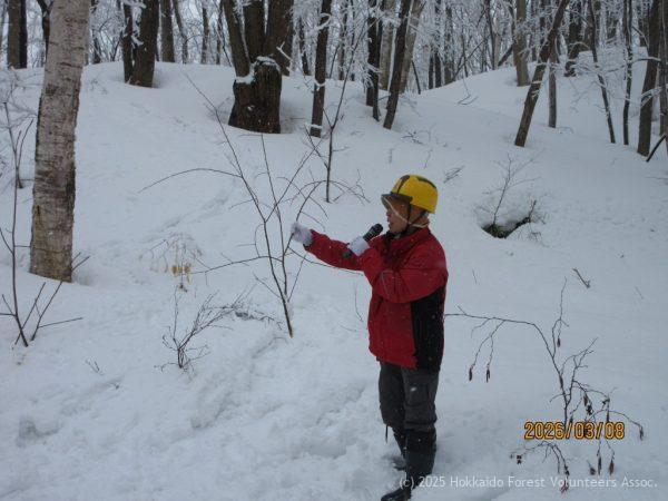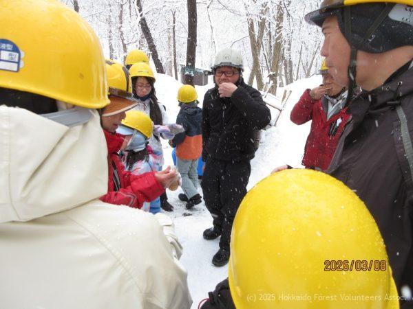 市街地は強い風と雨の朝でした。悪天候に負けず集まった協会員8名がサポートし、雪景色の澄川の森で今年度最後の親子森林教室が行われました。