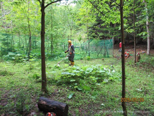 活動には5名が参加し、避難小屋のテント設営、防獣網の補修・破損した支柱の交換、ギャップ地左右の作業道草刈りなどを行いました。