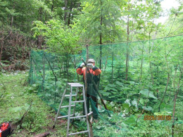 避難小屋テント設営、防獣網補修、作業道草刈り