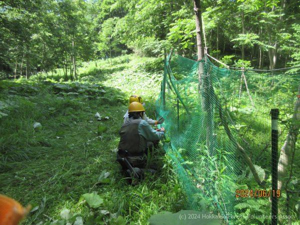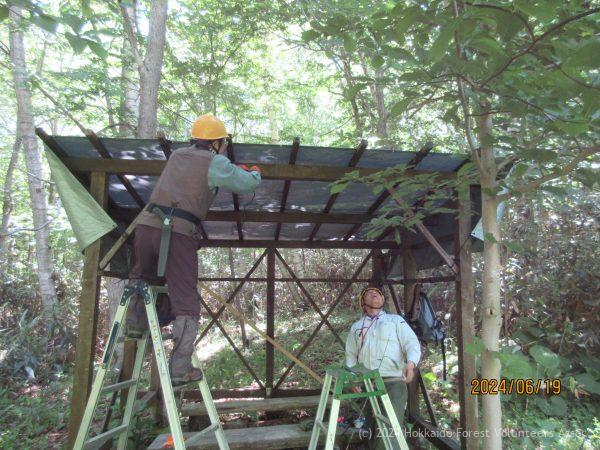 避難小屋屋根シート設置、食害防止網補修、竹支柱採取