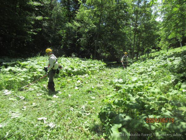 避難小屋の屋根シート設置、食害防止網の補修、下草刈り、竹支柱の採取(150本余り)、倒木処理など盛りだくさんの作業を行って終了しました。