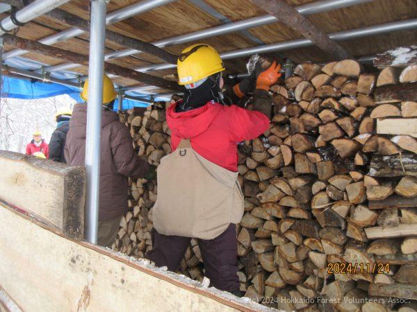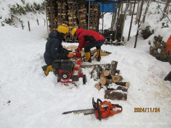 午後は苗畑の防獣網を下ろし、薪作りをしています。体験のご夫婦は自宅で薪ストーブを使用し普段から斧で薪割をされているとのことで、強力な助っ人を得て作業がはかどりました。