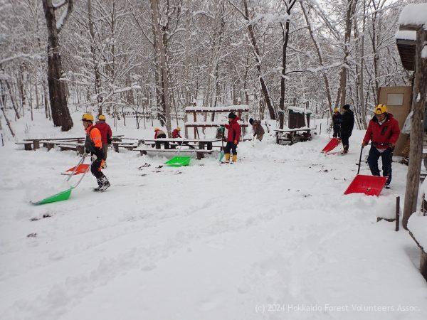 夜半からの雪が積もり真白の森になりました。集合場所では今季初の雪かきが行われ、準備体操前にしっかり汗をかきました。