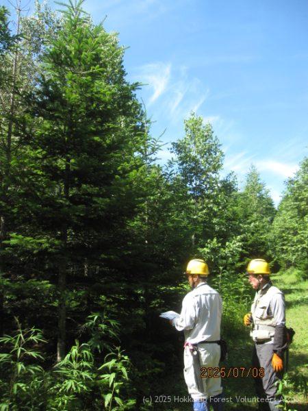 B班(4名)は2-9列で標準列の樹高と周長を測定しました。作業終了後に参加者全員で来年以降は少し間伐作業を行い今後も生長調査を続ける方向で話し合いました。
