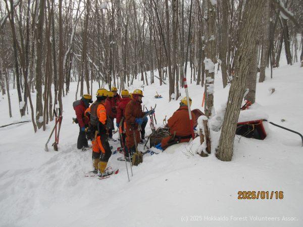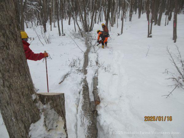 E-2区では避難小屋を倒壊しないようチルホールで引きながらイヌエンジュの木を伐倒予定 この作業のため機材をA-1区より運搬しましたが、これが思いのほか重労働で積雪時の移動の大変さが身に沁みました。