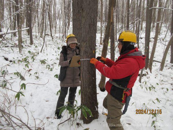 ・モニタリング調査班はF4地区の20m角内の立木を調査しています。