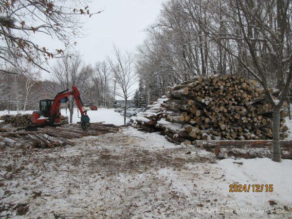 F地区からやまのかいしゃで集材した材を駐車場奥に積み上げ終了に向け整理作業をしていました。
