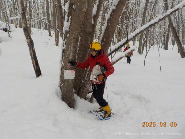 親子班は9日に樹液採取する6本のイタヤカエデを選定。そり滑りのコース作りをしました。