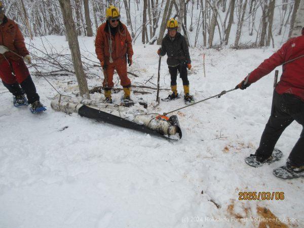 E-8区では伐倒後丸太の集材を省力化するために狩猟用のシカ運搬用シートを試行しました。