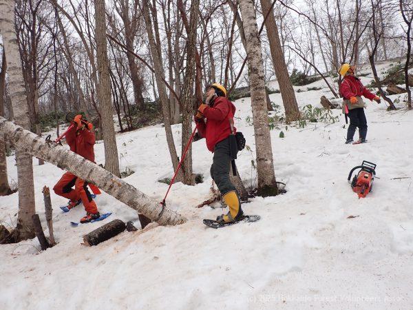 黄色いテープをつけた整理伐予定木も残りわずかになり、作業道脇には玉切りした丸太がずらりと積み上がっています。