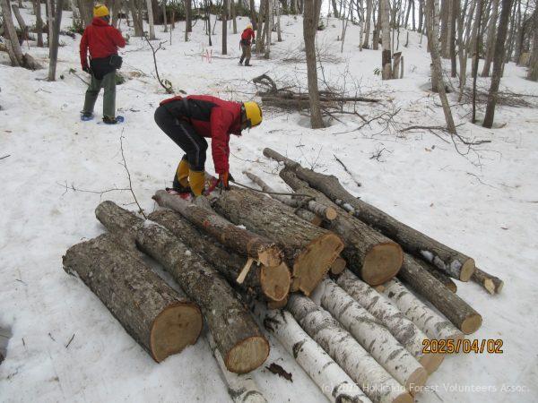 今日の活動は13名が参加し、E-8区の整理伐・集材、E-4区にある避難小屋の点検、チェンソーの整備等を行いました。避難小屋は10年が経過してかなり痛んできており大規模改修が必要な状況でした。